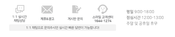 전화 : 1644-1274|팩스 : 02-6925-3692|메일 : smilecat@miridih.com|개인정보 관리 책임자 : 정수영 COPYRIGHT(C) 2004 SMILECAT, ALL RIGHTS RESERVED.
